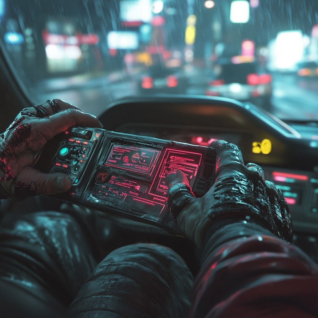 Создано на основе запроса: POV OF HANDS HOLDING CYBERPUNK XBOX HANDHELD DEVICE IN A CAR, PHOTOREALISTIC, CYBERPUNK, DRAMATIC