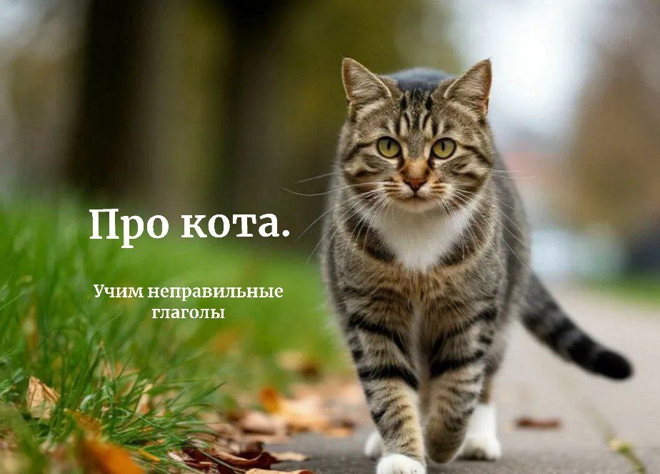 Проблема с запоминанием неправильных глаголов? Давайте попробуем выучить их вместе. Специально для своих подписчиков я срифмовала веселую историю про кота. Сегодня мы будем запоминать следующие глаголы: Неправильные глаголы. take took taken - брать, хватать. grow grew grown - расти, увеличиваться. feed fed fed - кормить. eat ate eaten - есть, кушать. drink drank drunk - пить. hear heard heard - слышать. fight fought fought - сражаться, драться. cut cut cut - резать. run-ran-run - бегать. hit hit hit - ударить. catch-caught-caught - ловить, поймать. bring-brought-brought - приносить, приводить. fall-fell-fallen - падать. get got got - получать. Мы котенка со скамейки Как-то взяли (take took taken). Только почему-то он Быстро вырос (grow grew grown). Ведь недаром добрый дед Кормит рыбой (feed fed fed). Кот с огромным аппетитом Карасей ест (eat ate eaten). Открывая лапкой кран, Воду пьет он (drink drank drunk). На прогулку кот идёт Слышим крики (hear heard heard). В бой ввязался грозный