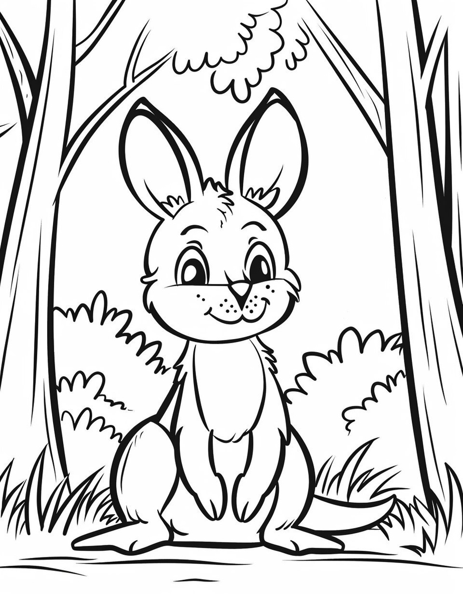Создано на основе запроса: A simple black-and-white coloring page for toddlers (3 years old) featuring a cute cartoon kangaroo