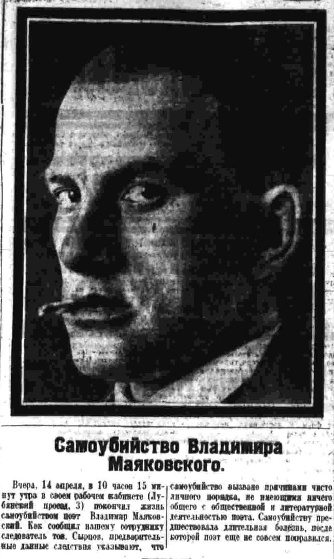 «Газеты – консервы времени» (Карл Краус) 15.04.1930 – Правда 15.04.1930 – Вечерняя Москва 15.04.1919 – Известия 15.04.1941 – Комсомольская правда 15.04.1992 – Известия 15.04.1992 – Известия 15.04.1988 – Известия 15.04.1918 – Речь 15.04.1944 – Комсомольская правда 15.04.1992 – Известия 15.04.1912 (02.04.1912 по старому стилю) – Коммерсантъ 15.04.1933 – Вечерняя Москва
