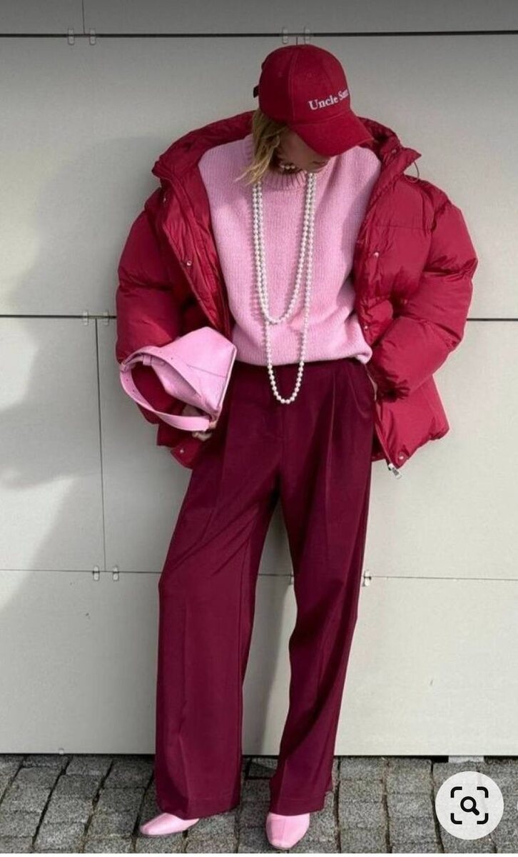 Сочетания — розовый + ягодный (вино/красно-фиолетовый). Десертно-ягодное, вкусное, сочное и эффектное сочетание розового с оттенками вишни, клюквы, вина отлично смотрится в городском стиле. Причем он может быть как более элегантным, так и более спортивным. #сочетание #цветовыетренды