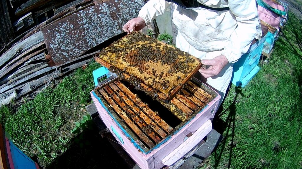 Осмотр улья пчёл и установка в апреле первой рамки с вощиной