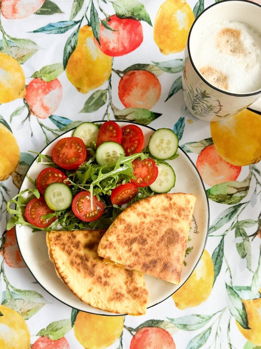 Завтрак. Тортилья с яйцами, салат, кофе с молоком. КБЖУ 510/31/30/30.