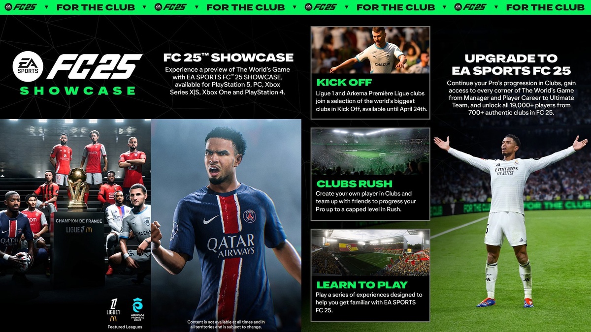 Высшие дивизионы Франции входят в FC25 SHOWCASE. Ligue1 и ArkemaPL - доступны для предварительного просмотра в SHOWCASE до 24 апреля. Новый в этом сезоне SHOWCASE дает вам представление о том, что нового в FC 25, с чередующимся выбором режимов и контента, включая Kick Off с выбранными клубами, Clubs Rush с ограниченным прогрессом и Learn to Play. FC25 SHOWCASE - это замена привычному всем ограниченному функционалу выходящих demo версий игр.