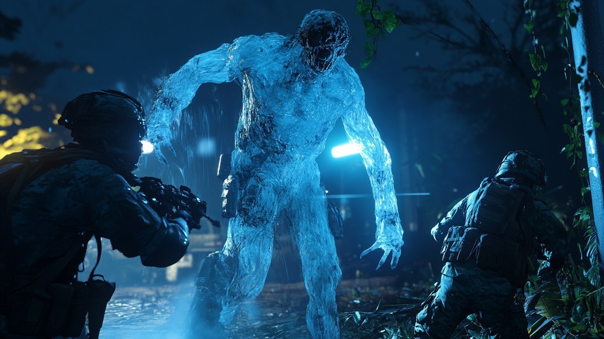 Создано на основе запроса: In a dark, humid jungle at night, soldiers in hazmat suits and tactical gear are struggling to restrain a tall