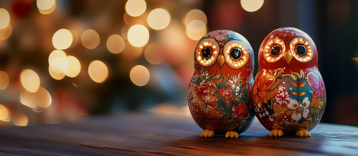 Создано на основе запроса: beautiful cute folk rosemaling matryoshka doll fiber optic floral owls, over a wooden table , professional color grading, soft shadows, no contrast, clean sharp focus, film photography, christmas lights background