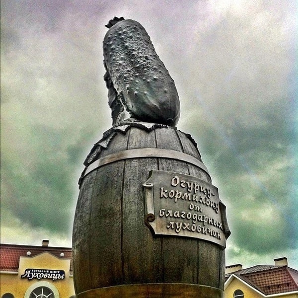 Необычный памятник в виде бочонка с огурцом, на котором надпись «Огурцу-кормильцу от благодарных луховичан» установлен в центре города.