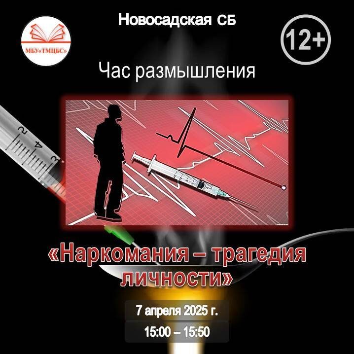 Анонс. Час размышления «Наркомания – трагедия личности» 📆7 апреля 2025 г. 🕑15:00 – 15:50 🏡Новосадская СБ Наркомания – одно из самых страшных явлений современности. С каждым днём всё больше людей, особенно молодежи, попадают в ловушки этого порока. В ходе мероприятия библиотекарь расскажет молодежи о вреде наркотиков, ведь наркомания с каждым годом всё больше распространяется, затягивая в свою зависимость тысячи людей. Участники смогут: - Узнать правду о наркомании и развеять мифы. - Обсудить, как защитить себя и близких от наркотической зависимости. - Узнать о мерах административной ответственности за употребление, хранение и сбыт наркотических средств. Открытый диалог поможет участникам задуматься о важности здоровья и выбора светлого будущего без наркотиков. Приглашаем всех заинтересованных присоединиться к нам!