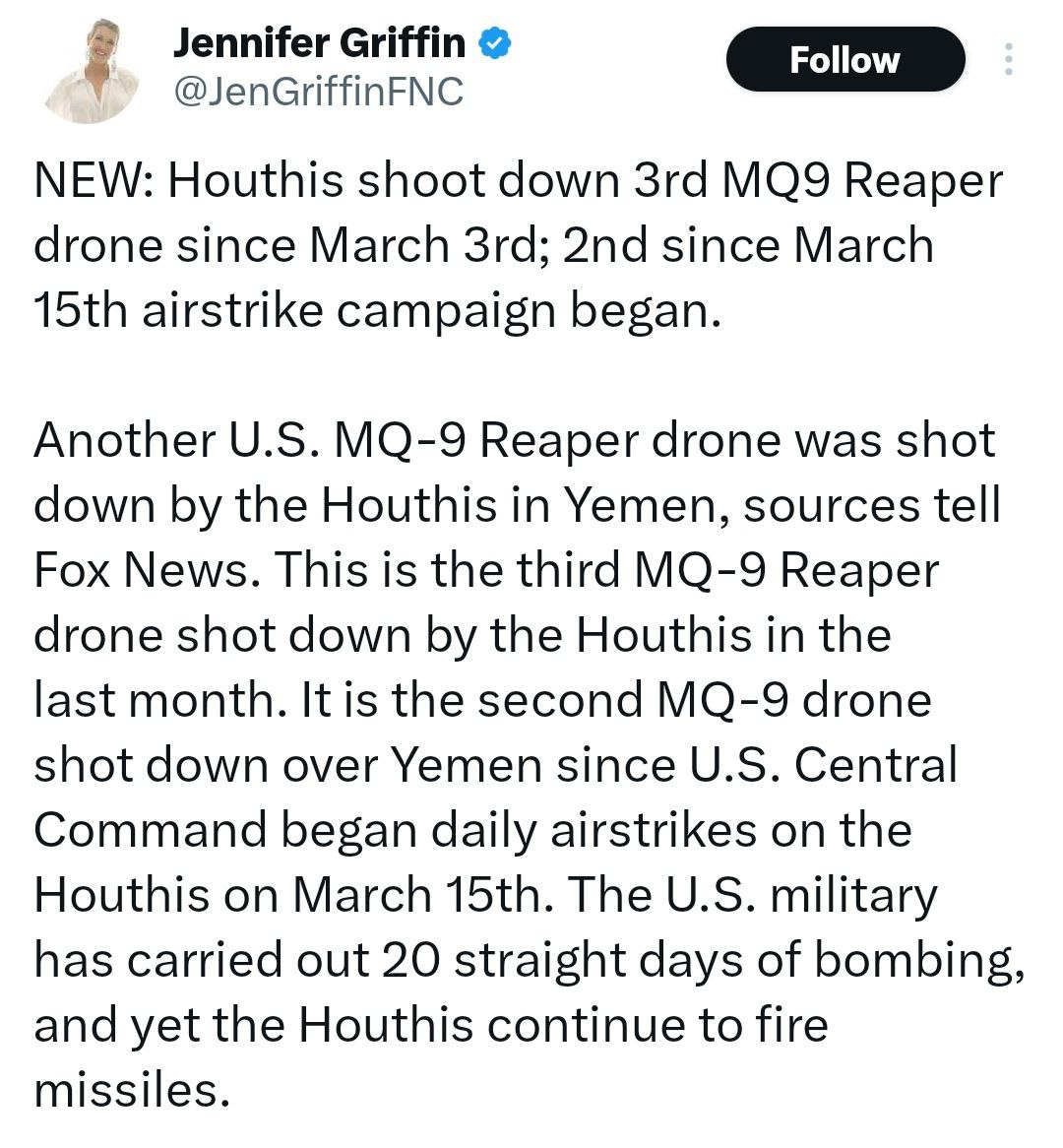 Houthis shoot down ANOTHER US drone, 3rd this month Fox News’ Griffin says US defense official confirms downing - each drone costs $30MN... #US #Houthis #Yemen