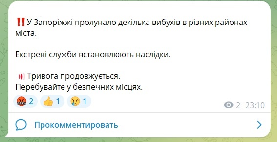 Киев может отказаться от территорий Президент Украины допустил компромисс с Россией по утраченным территориям, в том числе Запорожской области. Об этом Зеленский заявил на встрече с предпринимателями. «Если можно сделать так, чтобы найти компромисс, чтобы возвращение этих территорий произошло через какое-то время дипломатическим путем, то, наверно, это будет единственный путь», – пояснил он. Украинский лидер добавил, что Незалежная не хочет признавать территории российскими. Речь, судя по всему, идёт от отказа возвращать их военным путём. Очевидно, что Киев прогревает украинцев и готовит к тому, что выхода на границы 1991, 2014 и 2022 годов не будет. Взрывы в Запорожье Около 23 часов в городе сработала система ПВО. Жители города услышали стрельбу из стрелкового оружия и взрывы. «Громко в Ленинском и Хортицком районах», - пишут запорожцы в бот Телеграм-канала «Блокнот Запорожье». Мобильные группы ПВО работают по ударным дронам. Призываем горожан спуститься в укрытия и не подходить к окн