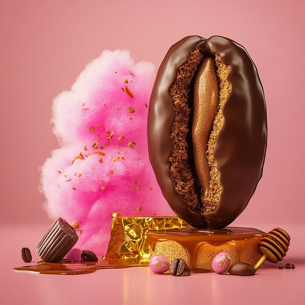 Создано на основе запроса: 3D thick milk chocolate shaped as a coffee bean. Packaged in a translucent crinkled paper. A neon pink ribbon with golden base on the lower third of the package. A cross section of the above is shown beside it without the packaging. With coffee and honeycomb and pink cotton candy and caramel sauce dripping out of it