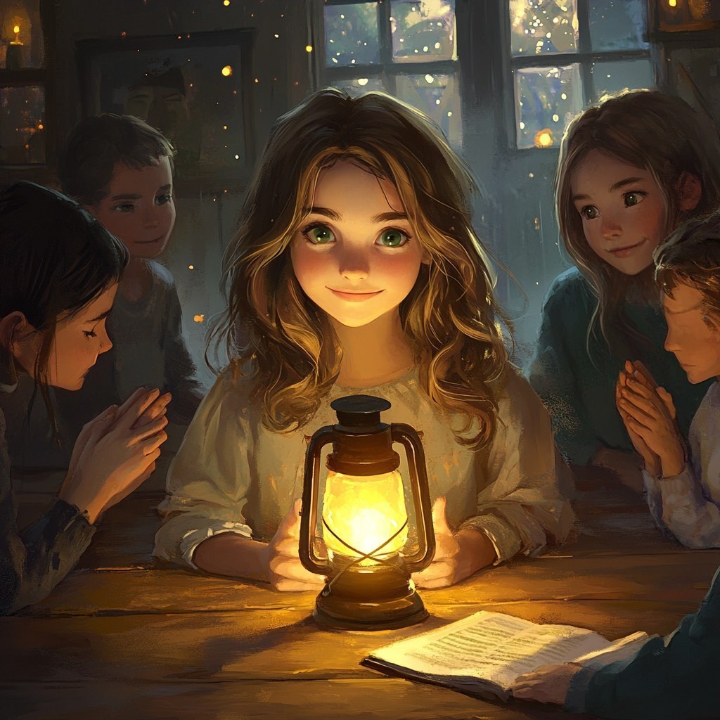 Создано на основе запроса: a 9-year-old Grace is gathering with family around the wooden table with the glowing lantern. She had shoulder-length wavy brown hair that frames her face and has bright green eyes. They are all full of warmth and love. they are praying together over the family bible