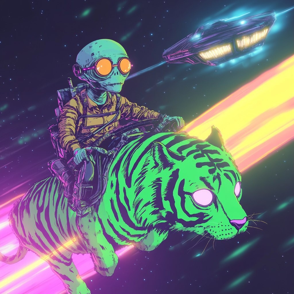 Создано на основе запроса: rotoscope animation. cyber punk theme. alien wearing glasses riding a green tiger with 4 eyes. UFO hovering with light coming from it. neon colors. --- Автоперевод: Ротоскоп анимация. Как тебе такой вариант? 🤔 https://dzen.ru/id/65c0c65c86e4f837c27b24d7 #ИИ #AI #нейросеть #midjourney #art