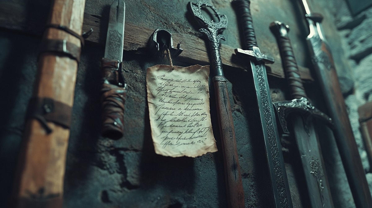 Создано на основе запроса: photograph of a fantasy letter posted on a vikings weapons rack