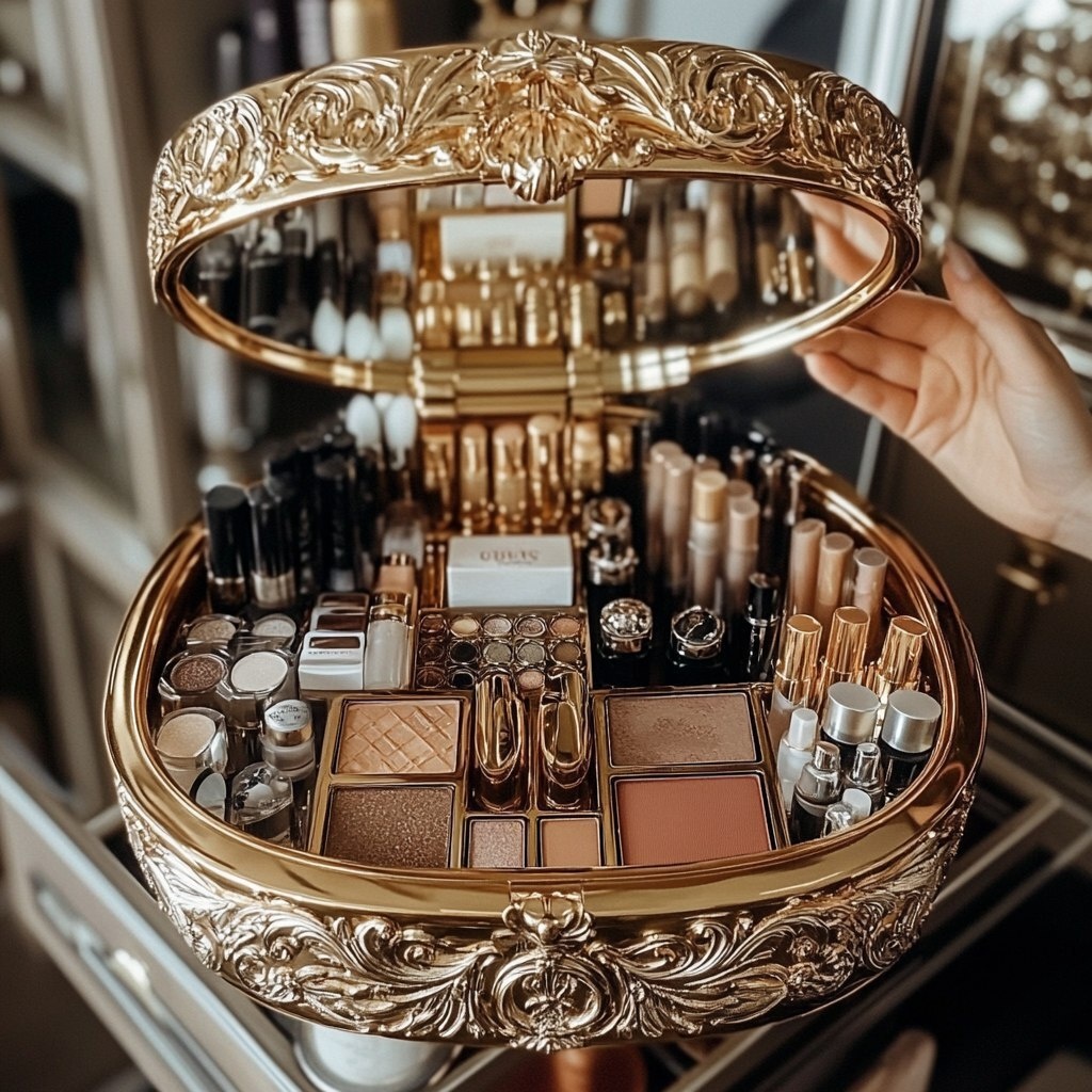 Создано на основе запроса: create a golden elegant tray with a lot of makeup in it, someone is holding the lid over it