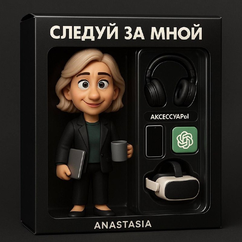 Еще один promt: Создай коллекционную игрушечную фигурку по имени [Анастасия], вдохновлённую стилем мультфильма «Вверх» (Up, 2009) от Pixar. Фигурка одета в [стильный тёмный office core: черный пиджак, чёрные брюки, базовая темно зеленая футболка]. В одной руке — [ноутбук, во второй — серая кружка]. Упаковка выполнена в стиле премиальной коллекционной коробки в чёрных тонах с глянцевыми акцентами и прозрачным окошком. Слева — сама фигурка в полный рост (лицо взять с референса 1/1). Справа — секция «АКСЕССУАРЫ», где аккуратно расположены инструменты профессии: [наушники, смартфон, VR-шлем, иконка ChatGPT]. В верхней части упаковки жирными буквами написано: [Следуй за мной ]