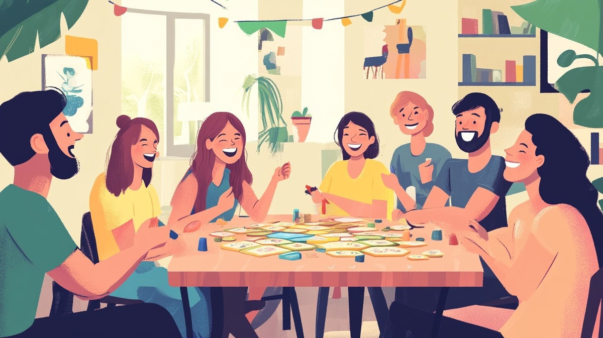 Создано на основе запроса: illustration of a boardgame playing lots of happy people, soft colors, playful atmosphere, catan