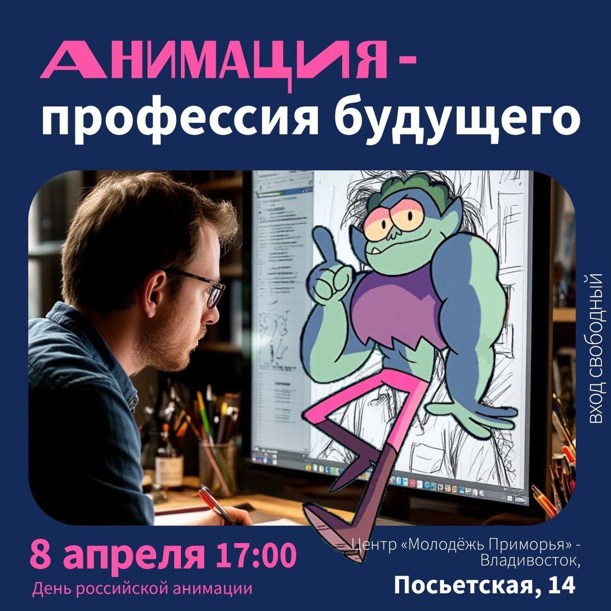 8 апреля — замечательный день! День Российской анимации! Мы очередной раз выходим "в люди"! В месте с нашим большим другом и соратником Алексеем расскажем о профессиях в анимационной индустрии! Будет интерактивная лекция для тех, кто желает посвятить свою жизнь этому волшебству. Зовем особенно старших школьников и студентов, а также всех влюблëнных в мультики!!!