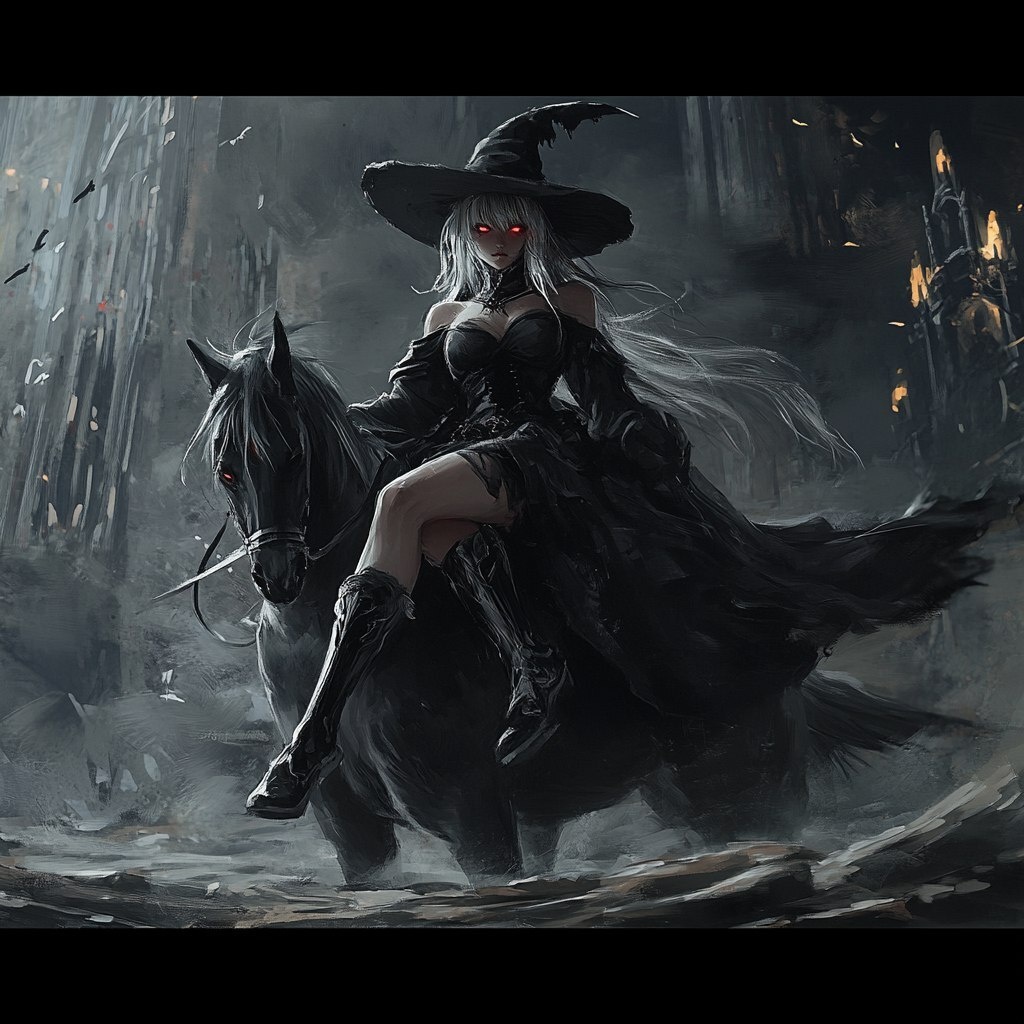 Создано на основе запроса: a beautiful girl with long white hair, dressed in all black, galloping toward the viewer on a powerful horse, her eyes glowing red. The rider’s face is obscured in shadow, due to the large, witch hat she wears. Very rough and unfinished. analyze the image given and use the same brush strokes and little detail