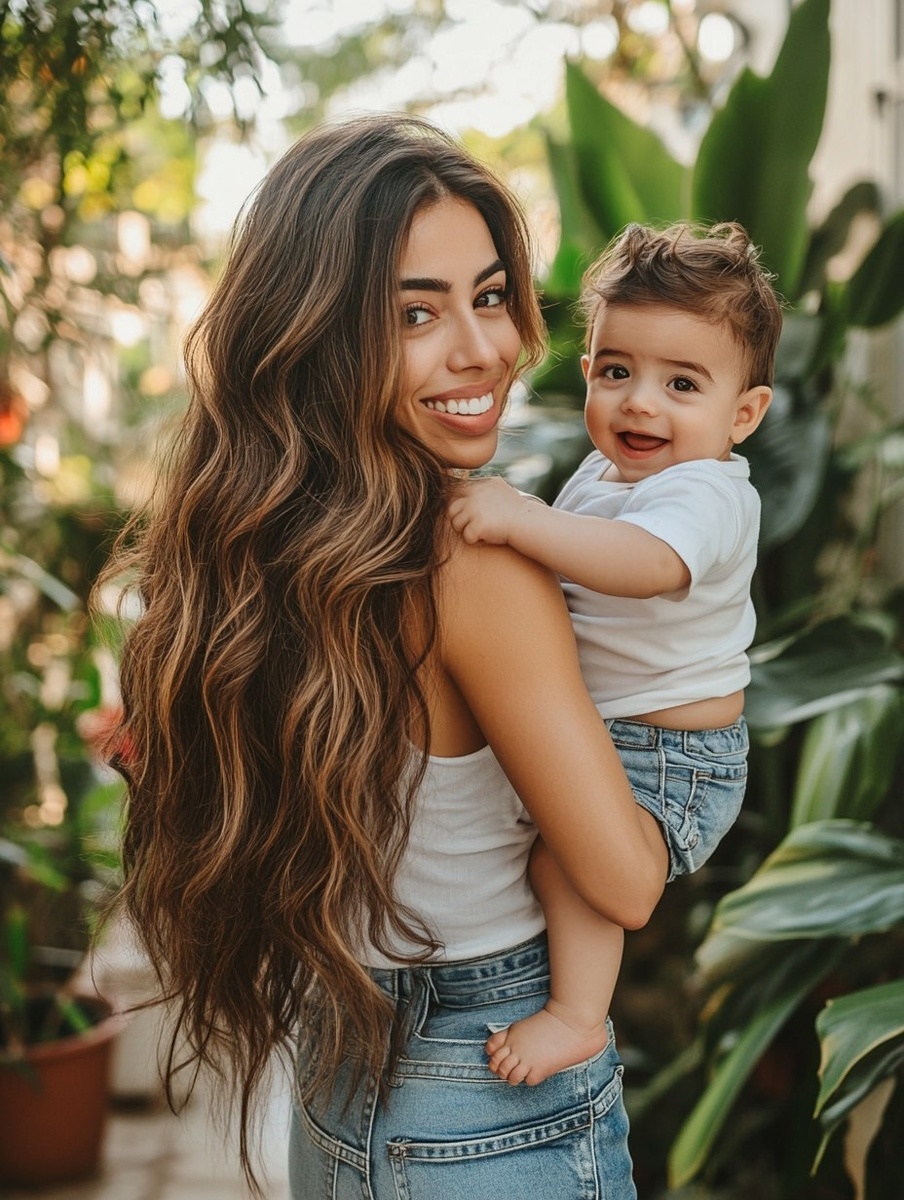 Создано на основе запроса: A photo of the beautiful and smiling Egyptian woman with long, wavy hair wearing jeans, holding her baby in one