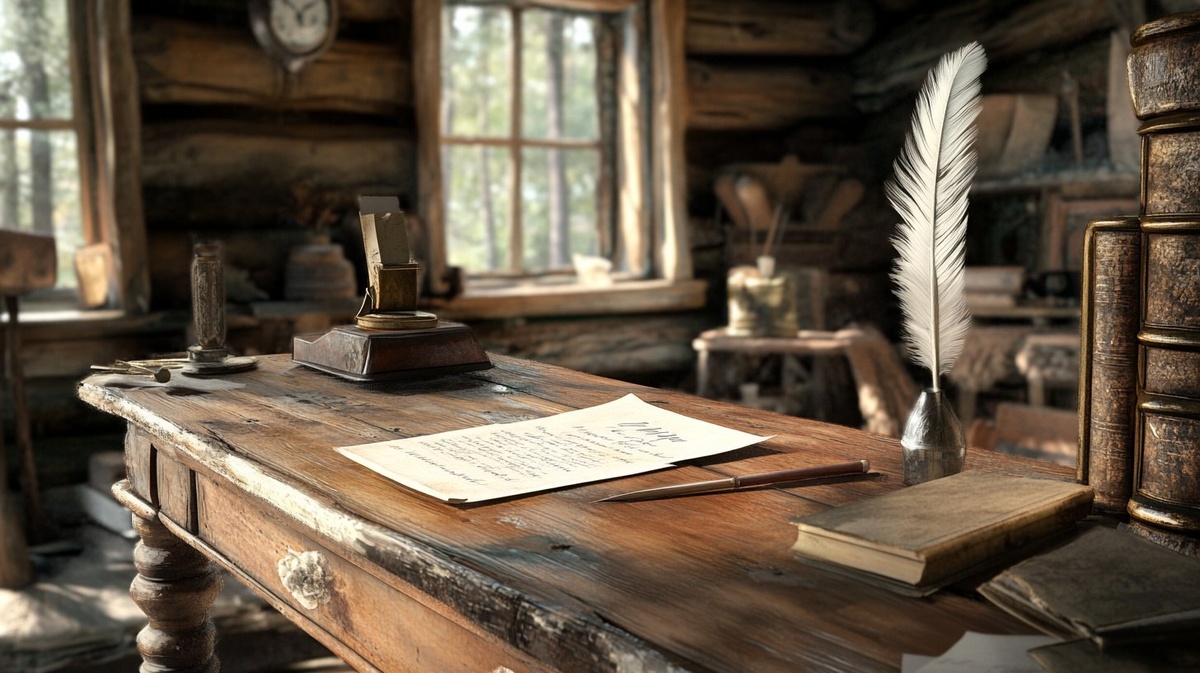 Создано на основе запроса: fantasy image of a wooden desk in a cabin with a feather quill writing a letter