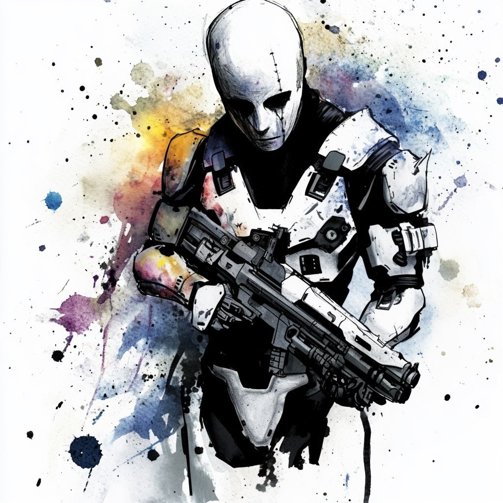 Создано на основе запроса: Threatening, face-less sci-fi soldier. Like a mannequin with armor. No emotion. Science Fiction. Deep, creepy color palette, watercolor and ink, bold lines, spatter.