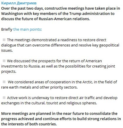 В ответ на пост Dmitriev with main points from his talks with top US officials: — Russia and US ready for direct dialogue — US investments could come back to Russia — Potential cooperation in Arctic and with rare earths — Direct flights could be coming back soon #Russia #US