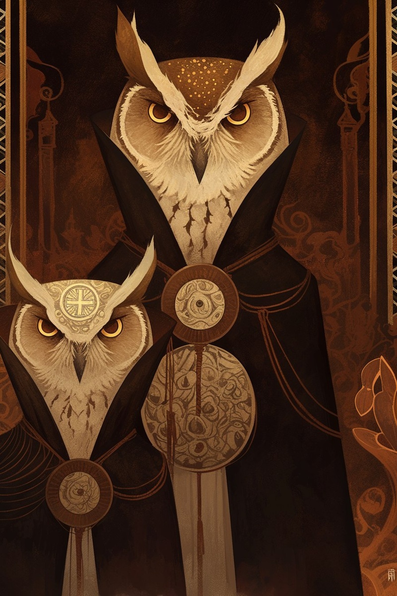 Создано на основе запроса: A duo of anthropomorphic fiber optic floral owls as dark gothic mystics, high contrast pointillism style, dark