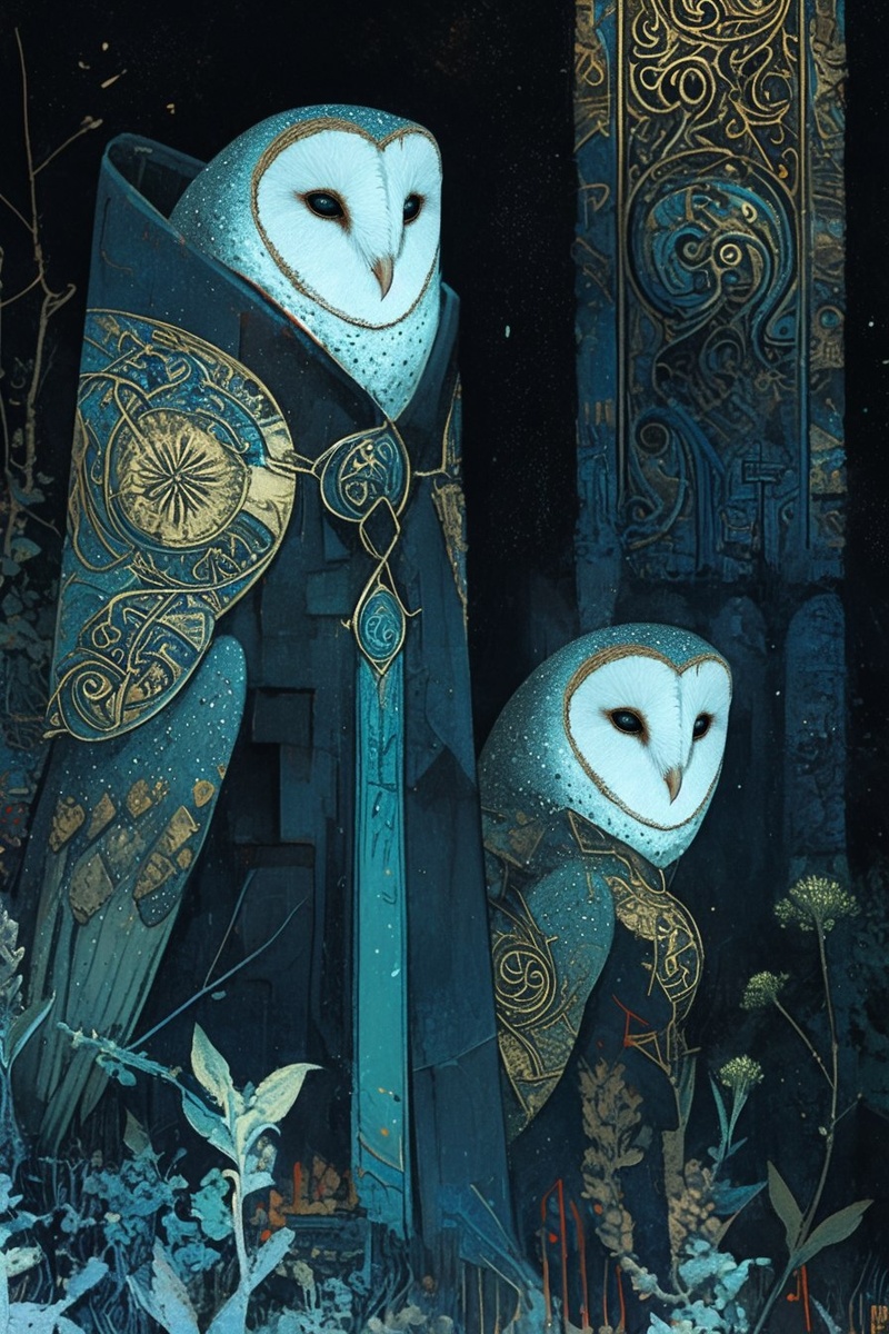 Создано на основе запроса: A duo of anthropomorphic fiber optic floral owls as dark gothic warriors, high contrast pointillism style, dark