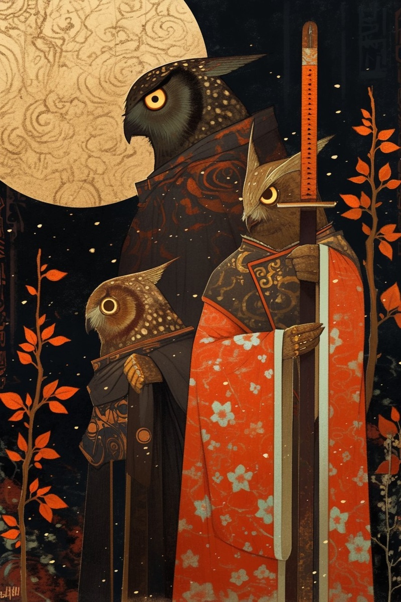 Создано на основе запроса: A duo of anthropomorphic fiber optic floral owls as sci fi bounty hunters, high contrast pointillism style, dark background, maximalist, Tim Hildebrandt, Greg Hildebrandt, Ralph McQuarrie