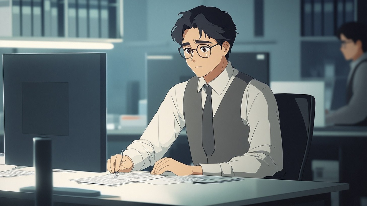 Создано на основе запроса: anime-style scene of a Japanese businessman working alone at his desk in a modern office, focused expression