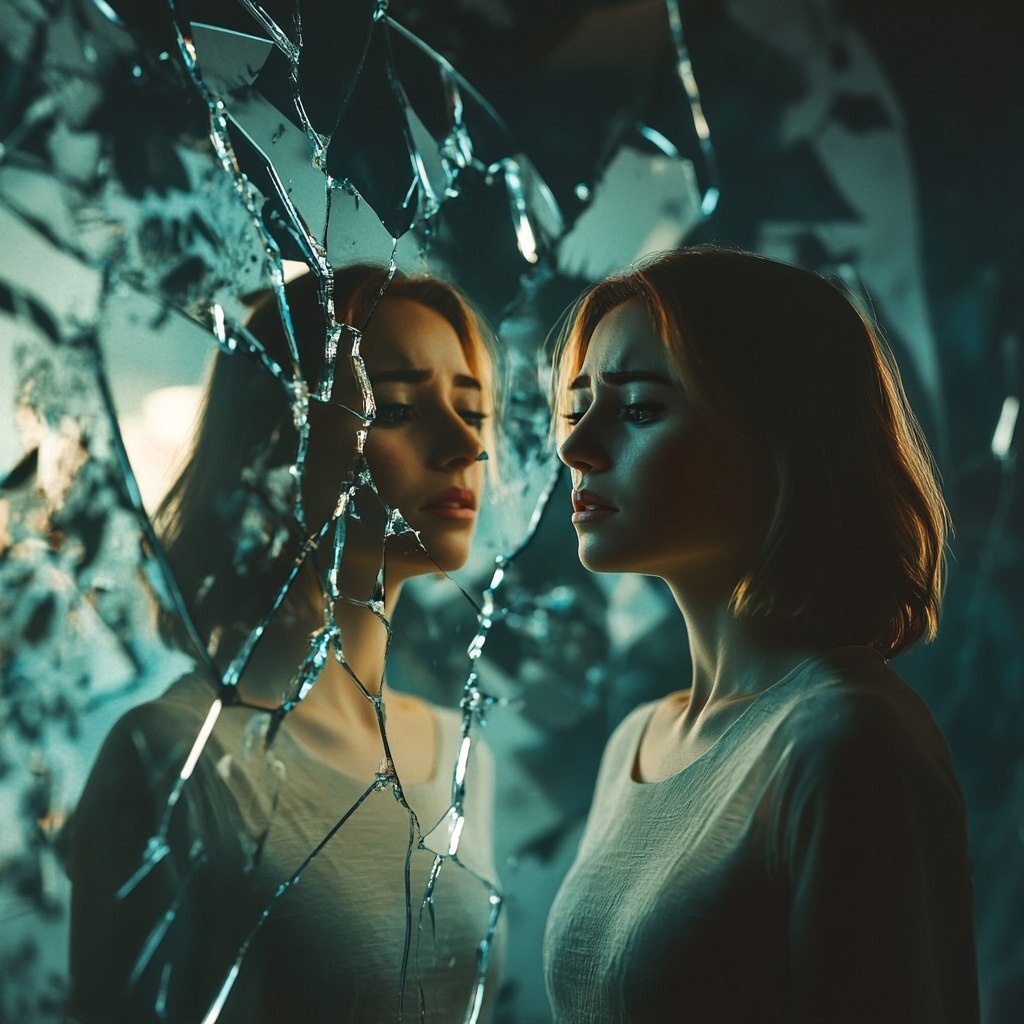 Создано на основе запроса: A woman standing in front of a large cracked mirror