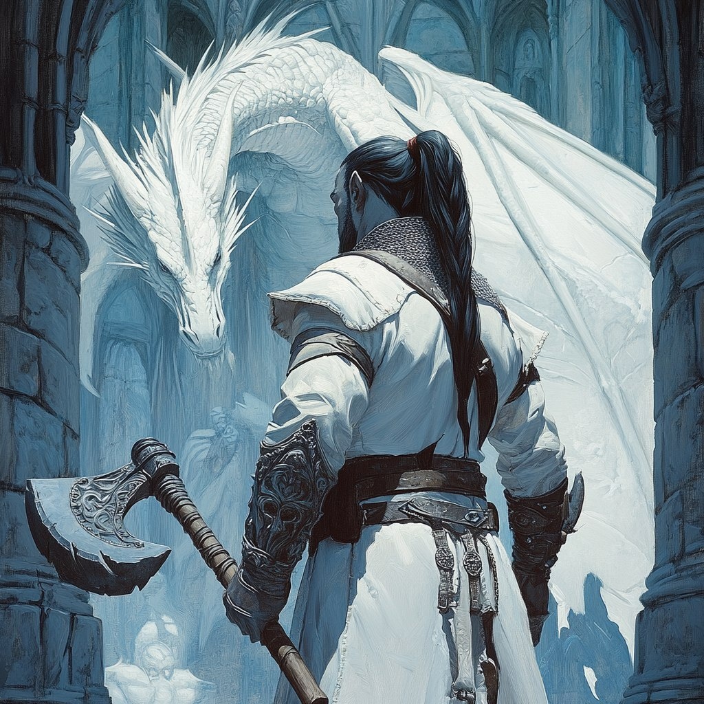 Создано на основе запроса: a grey-skinned half-orc warrior with a ponytail in a white tabard, seen from behind. He holds an axe and faces a white dragon. Pale blue shade, stone cathedral setting, painting by Michael Whelan --- Автоперевод: Серенная кожаная воин с хвостом в белой табарде, увиденная сзади. Как тебе иллюстрация? 🤔 https://dzen.ru/id/65c0c65c86e4f837c27b24d7 #ИИ #AI #нейросеть #midjourney #art