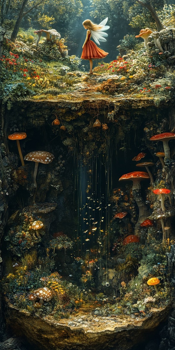 Создано на основе запроса: dark forest cross section forest on top, girl fairy unfurling under the earth like a larva in a cavern underneath