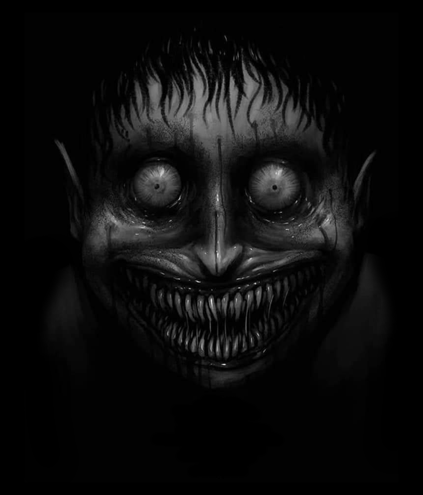 Эта было то самое существо. Сомнений быть не может, это точно оно. Оно смотрело прямо на меня, и в свете экрана я наконец увидел его лицо. И тогда окончательно убедился, что это был не человек. Огромные, круглые, немигающие глаза с мелкими точками-зрачками были словно стеклянные, отражая изображение на экране. По всему лицу были морщины, а вокруг глаз виднелись чёрные круги. Вытянутые уши, узкий длинный нос. Широко открытая безгубая пасть, в которой виднелись бесконечные ряды кривых зубов была растянута в жуткой улыбке от уха до уха. Из его пасти сочилась некая чёрно-коричневая жидкость, непрерывно капающая на пол. Какое-то время оно просто смотрело на меня, издавая те самые звуки. А затем, растянулось в ещё более широкой ухмылке, что до этого казалось невозможным.
