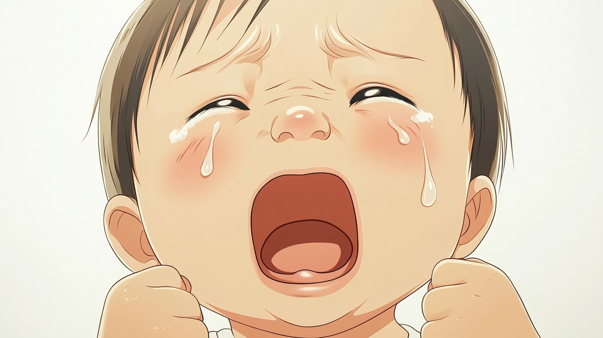 Создано на основе запроса: anime-style close-up of a 0-year-old Japanese baby crying, full screen composition, soft round face, teary eyes, flushed cheeks, mouth open wide in a wail, tiny fists clenched, delicate baby skin tones, gentle pastel shading