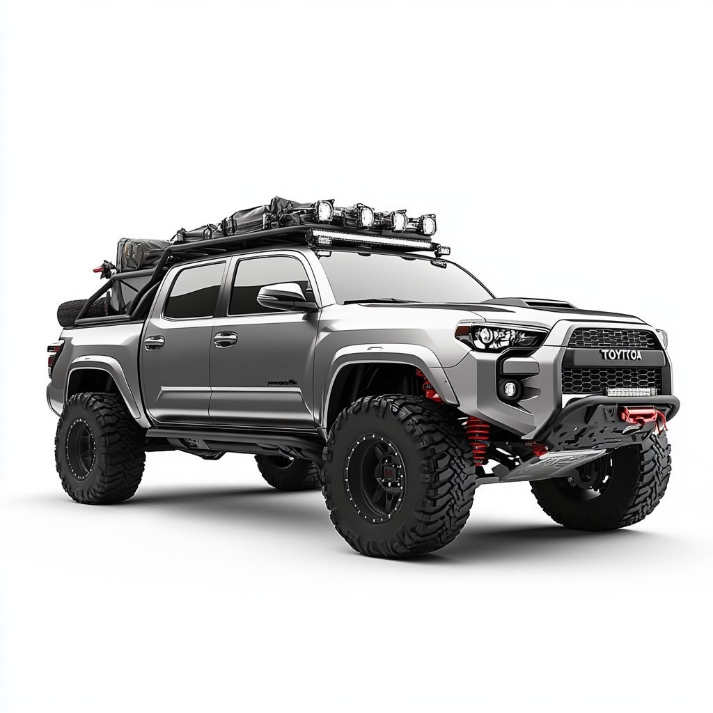 Создано на основе запроса: a overlanding showcar toyota prerunner truck trd with offroad tires and a roof rack add lights to the rack ditch lights and a aftermarket front bumper. photo realistic, dynamic angle on white background facing left --- Автоперевод: ТРБ из сухопутации Toyota Prerunner Trd с заездом с шинами и стойкой на крыше добавляет свет на светильники стойки и вторичный передний бампер. Как тебе такая картинка? 🤔 https://dzen.ru/id/65c0c65c86e4f837c27b24d7 #ИИ #AI #нейросеть #midjourney #art