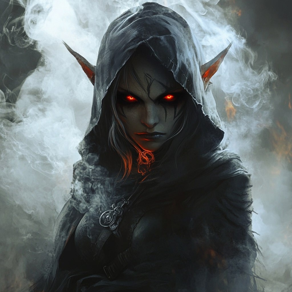 Создано на основе запроса: Fantasy portrait, female drow elf, dark skin, pointed ears, hooded cloak, casting a shadow, glowing red eyes, smoke, full body portrait, macabre scene, daniel merriam art style
