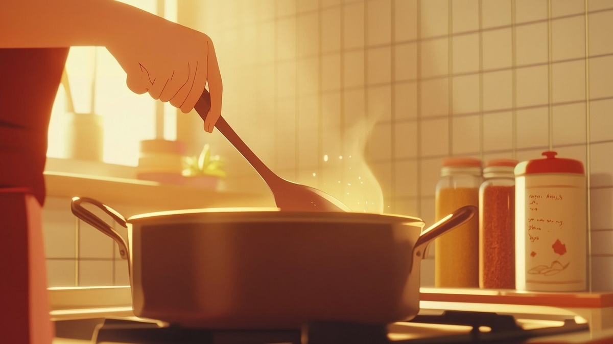 Создано на основе запроса: Japanese anime style, close-up of a ladle stirring gently in a simmering pot, hands of a woman visible holding
