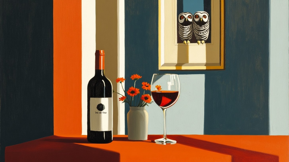 Создано на основе запроса: An minimalism painting on the wall of an apartment in naples of fiber optic floral owls, cigarette and wine on the table