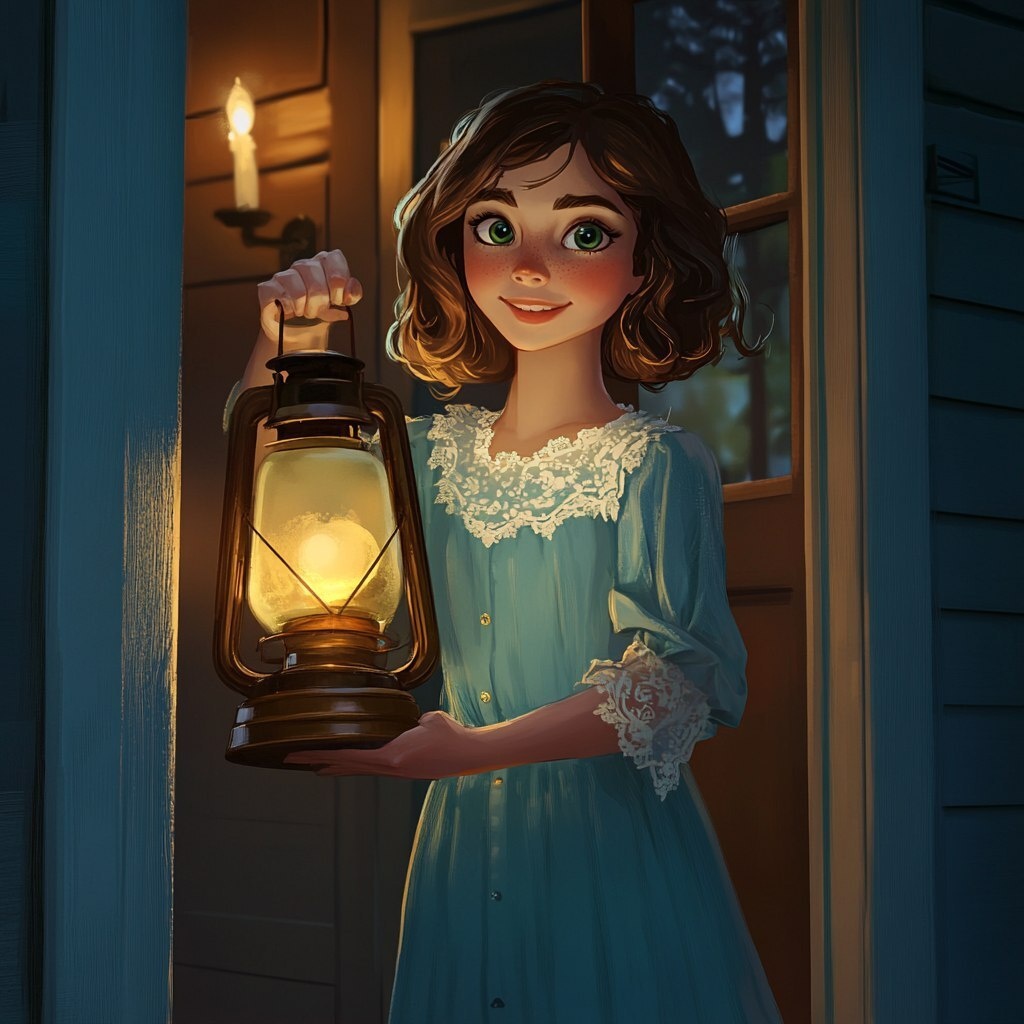 Создано на основе запроса: Grace standing at a neighbor’s door, her antique brass lantern glowing softly. Her shoulder-length wavy brown hair frames her bright green eyes, full of determination and warmth. She wears a cozy light blue dress with white lace trim and simple brown shoes. Inside, families gather by candlelight, smiling."