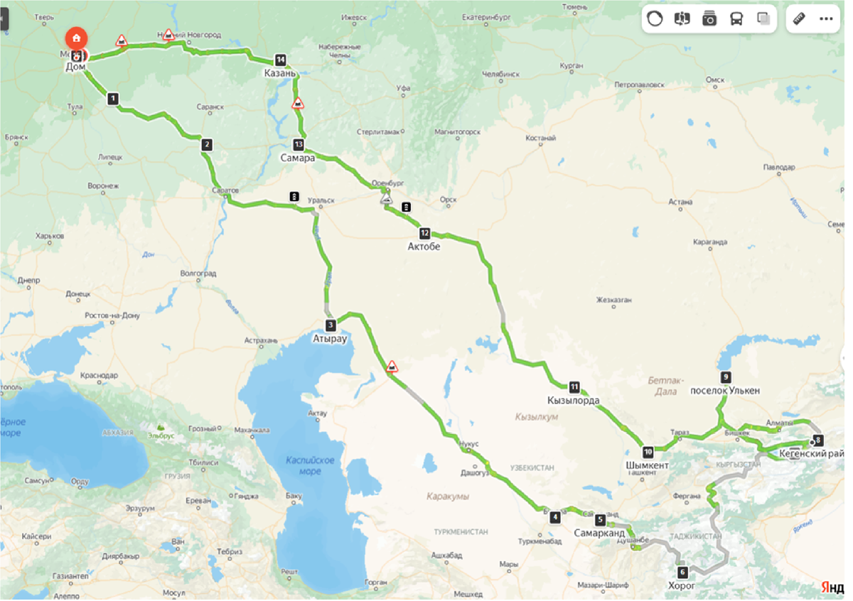Вторым этапом после выбора направления всегда идет составление укрупненного маршрута. Маршрут составляю на яндекс картах или google maps, сначала прокладывая укрупненный маршрут по основным городам.
