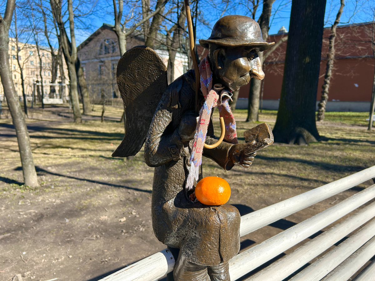 Симпатичный маленький ангел сидит на спинке скамейки и увлеченно читает книгу. Он похож на пожилого человека в старомодной одежде. В руке у старичка обязательный аксессуар петербуржца – зонт. Второй аксессуар – настоящий шарфик, связанный чьей-то доброй рукой специально для городского любимца. «Петербургский ангел» - творение художника Романа Шустрова, символизирующее пожилых петербуржцев, которые пережили блокаду и многочисленные невзгоды, но сохранили жизнелюбие и интеллигентность.