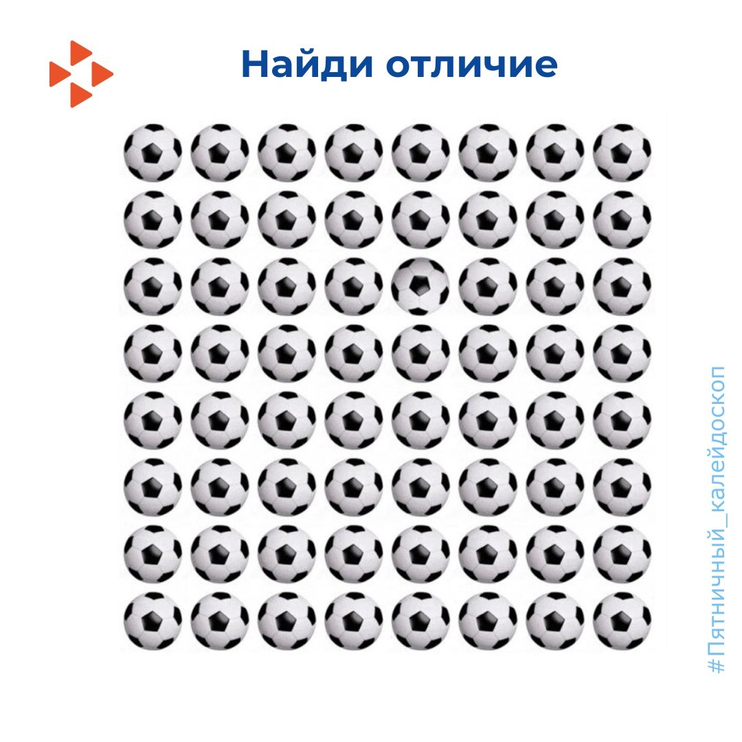Привет, друзья! Сегодня долгожданная пятница, а это значит, что мы играем в игру 😌Перед Вами картинка с футбольными мячами. Все они одинаковые, но только лишь один имеет отличие. Попробуйте найти его за 20 секунд и не перепутать с остальными 👇Пишите ваши ответы в комментариях Всем хороших выходных! #Пятничный_калейдоскоп #Кадровый_центр #Поиграем