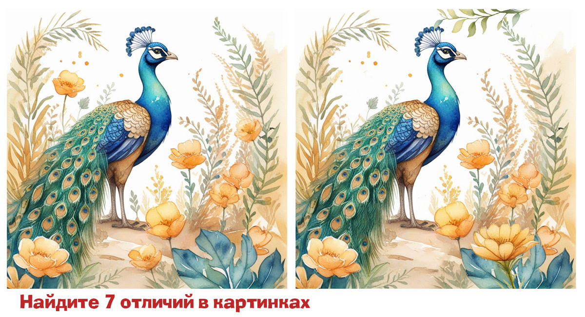 Найди 7 отличий. Тренировка внимания в мире природы. Великолепие павлина среди цветов.