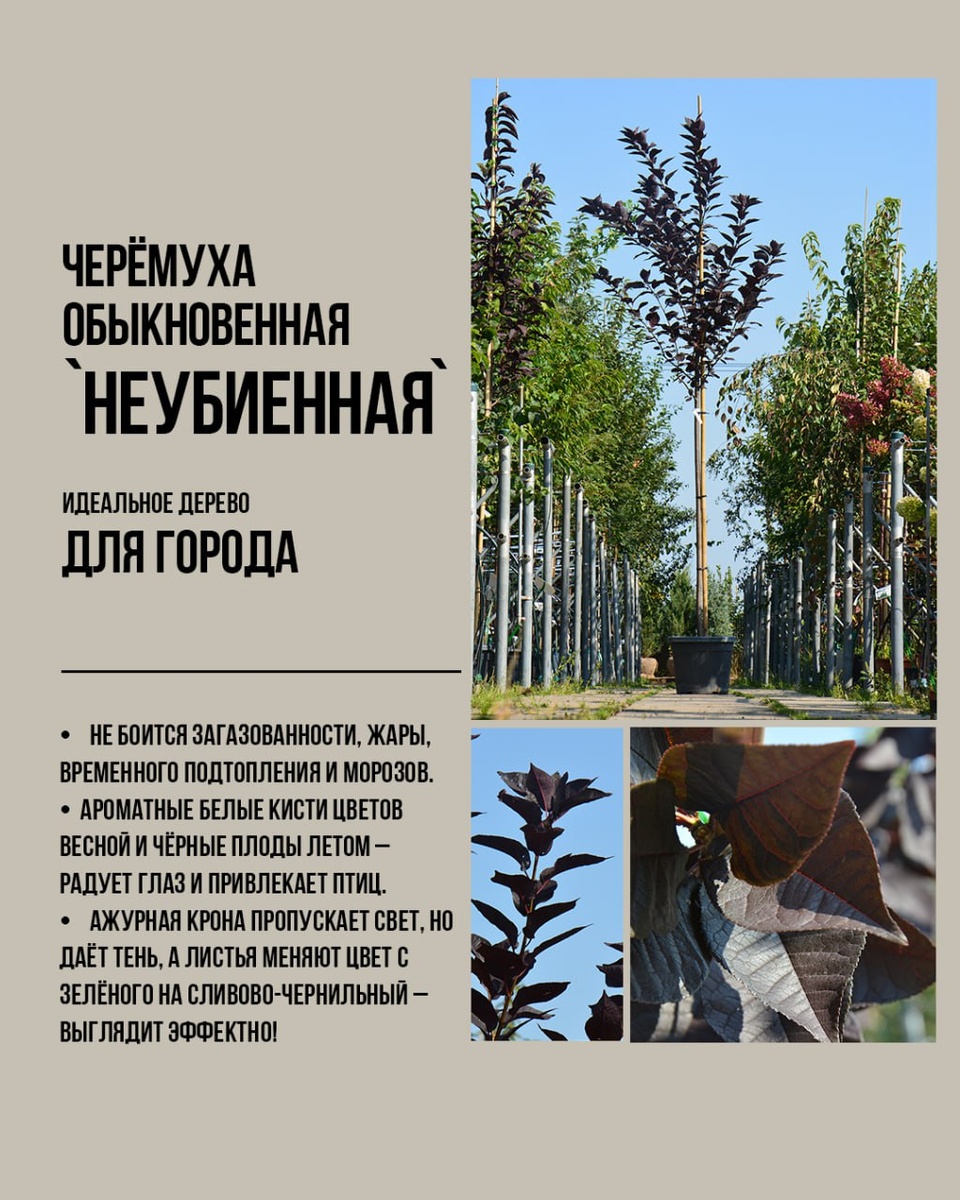 Черемуха "Неубиенная" – идеальное дерево для города! 🌿 Городским дворам и паркам нужно выносливое и красивое дерево? Знакомьтесь – Черемуха "Неубиенная"! ✔️ Оптимальный размер (9-10 м в высоту, 6-8 м в ширину) – не загромождает пространство, но создаёт эффектный акцент. ✔️ Ажурная крона пропускает свет, но даёт тень, а листья меняют цвет с зелёного на сливово-чернильный – выглядит эффектно! ✔️ Ароматные белые кисти весной и чёрные, съедобные плоды летом – радует глаз и привлекает птиц. ✔️ Не боится загазованности, жары, временного подтопления и морозов. Хотите по-настоящему надёжное и декоративное дерево? Выбирайте "Неубиенную"! 📍 Питомник "ЁЛЫ-ПАЛЫ" – зелёные решения для городов. В нашем питомнике вы найдёте черёмуху "Неубиенную" в контейнере С35, размер 300-350 см. цена в розницу 19 900 ₽. 📎https://yoly-paly.ru/catalog/cheremukha/cheremukha_obyknovennaya_neubiennaya_prunus_padus_neubiennaya/ #ГородскоеОзеленение #ЧеремухаНеубиенная #ЁлыПалы #УстойчивыеРастения #ЛандшафтГоро