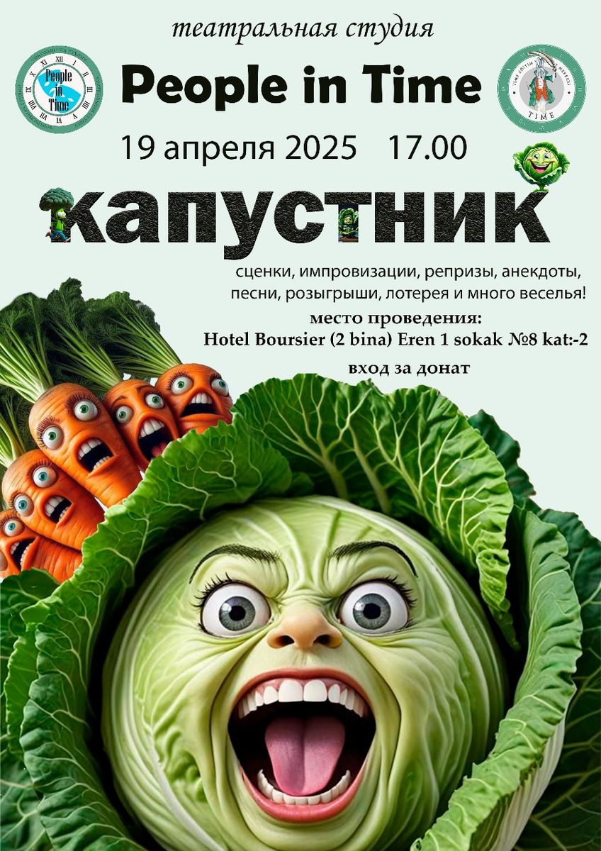 🔔 Это вполне обычное мероприятие для театральной студии People in Time в Стамбуле. Проводить такие открытые уроки для родителей учащихся — давняя традиция. ⚡А вот для Стамбула такой капустник будет премьерой! И вы приглашены! Капустник — это формат камерного концерта, состоящего из разножанровых номеров юных актеров. Будут сценки, импровизации, стихи, песни, розыгрыши, и, даже веселая лотерея, — все будет. Вы сможете отдохнуть в непринужденной приятной атмосфере радости, веселья, улыбок. Познакомиться с актерами и преподавателями студии, обзавестись новыми друзьями. Приходите сами, приводите знакомых, друзей и зарядитесь весенним позитивом! 📍 Когда: 19 апреля, 17:00 📍 Где: Стамбул, Меджидиекёй, Hotel Boursier (2-й этаж) /Eren 1 sokak No:8, Şisli Mecidiyekoy/ 📍 Стоимость: донаты (благотворительный взнос)