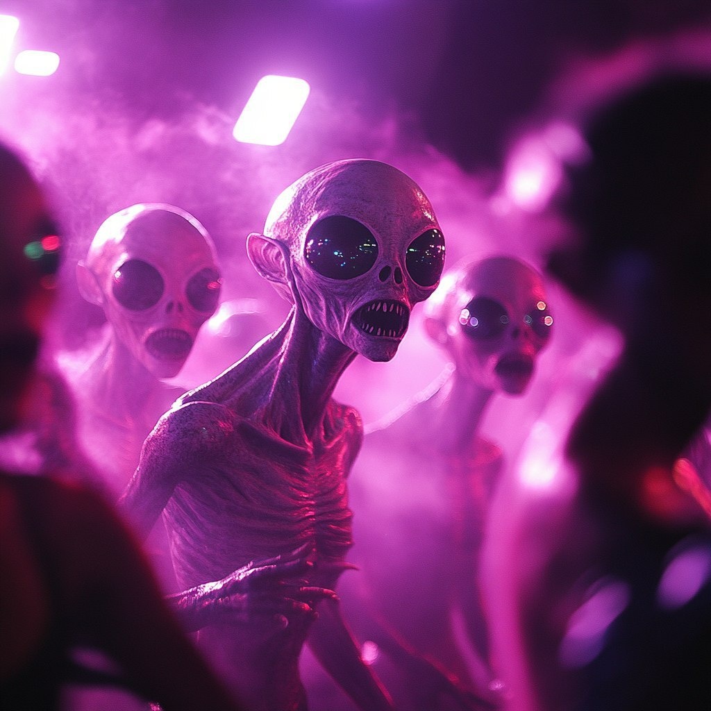 Создано на основе запроса: glow pink flourescent aliens in a dark night club dancing there's a smoke machine it's dark with lasers