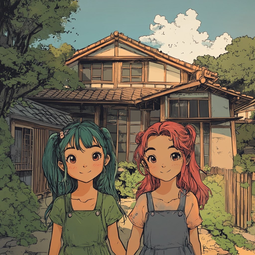 Создано на основе запроса: ghibli style manga picture of twins, female, 10 years old, asian born, in front of a house asian style