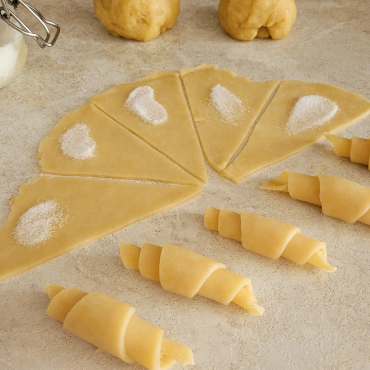 Думаю, многие помнят этот вкус рассыпчатого чуть солоноватого теста в сочетании со сладкой начинкой из сахара или повидла. Моя мама пекла эти печеньки почти каждые выходные, буквально, тазиками (!), но к концу воскресенья уже ничего не оставалось, так как невозможно было оторваться! Данный рецепт также подойдет тем, у кого есть аллергия на яйца и белок коровьего молока. Для теста возьмем: Смешать сухие ингредиенты, влить масло и кипяток. Перемешать ложкой или лопаткой, пока кипяток не разойдется , затем руками вымесить тесто. Разделить тесто на 2 или 3 шарика и положить под полотенчик на 15 минут. Затем шарики раскатать в круглую тонкую лепешку, разрезать на треугольники, и выложить на широкую часть начинку: сахар, повидло, варенье, шоколад - на ваш вкус. Главное не переборщить, иначе в процессе выпекания лишнее вытечет и будет подгорать. Закрутить треугольники от широкого края к тонкому, в форме рогаликов. Выпекаем получившиеся рогалики в предварительно разогретой до 180 градусов дух
